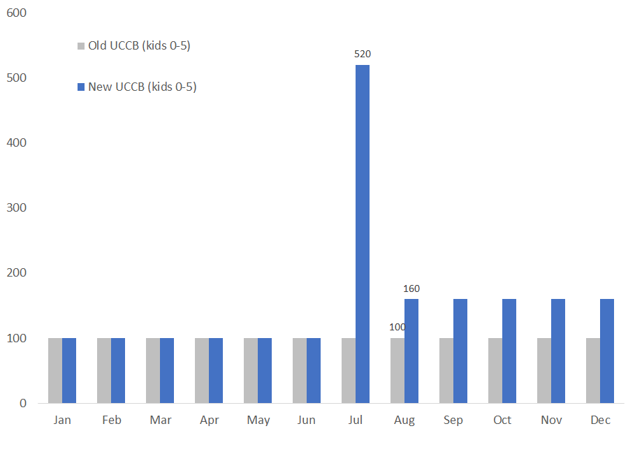 Here are the payout profiles for families with a child under 6 years old under the new and old policies.