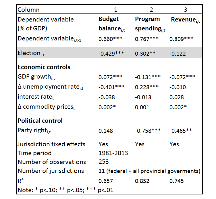 Using past research in political business cycles as a guide, let’s investigate this issue with annual data on elections as well as economic and budget outcomes for federal and provincial governments in Canada for 1990 to 2013.