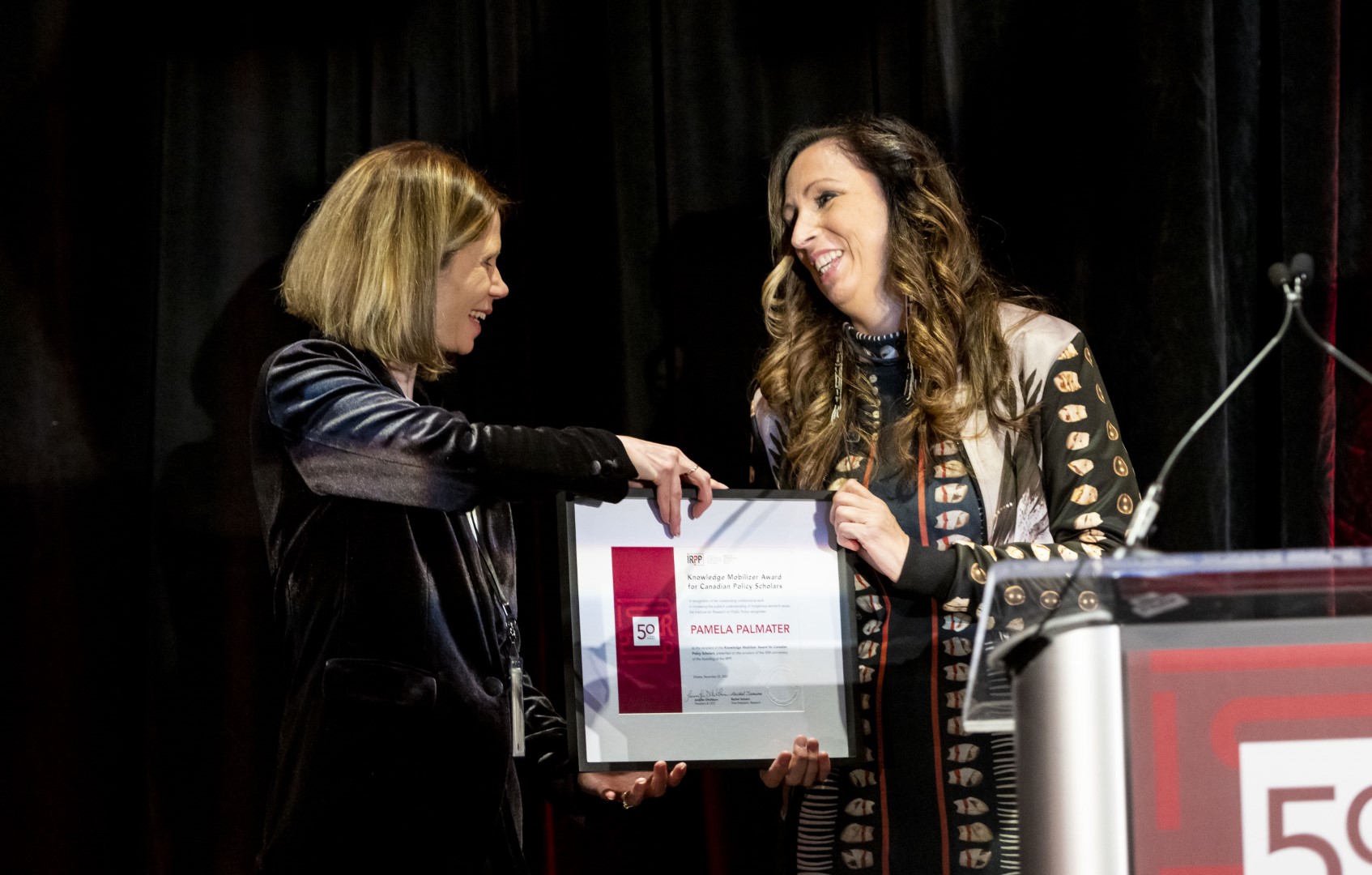 Over the course of the evening, we also presented the IRPP’s Knowledge Mobilizer Awards – one to Pamela Palmater, a Canadian researcher who has done an exceptional job in increasing the public’s understanding of a key public policy issue; and another to Brittany McDonald, a post-secondary student who won our public policy op-ed writing contest.